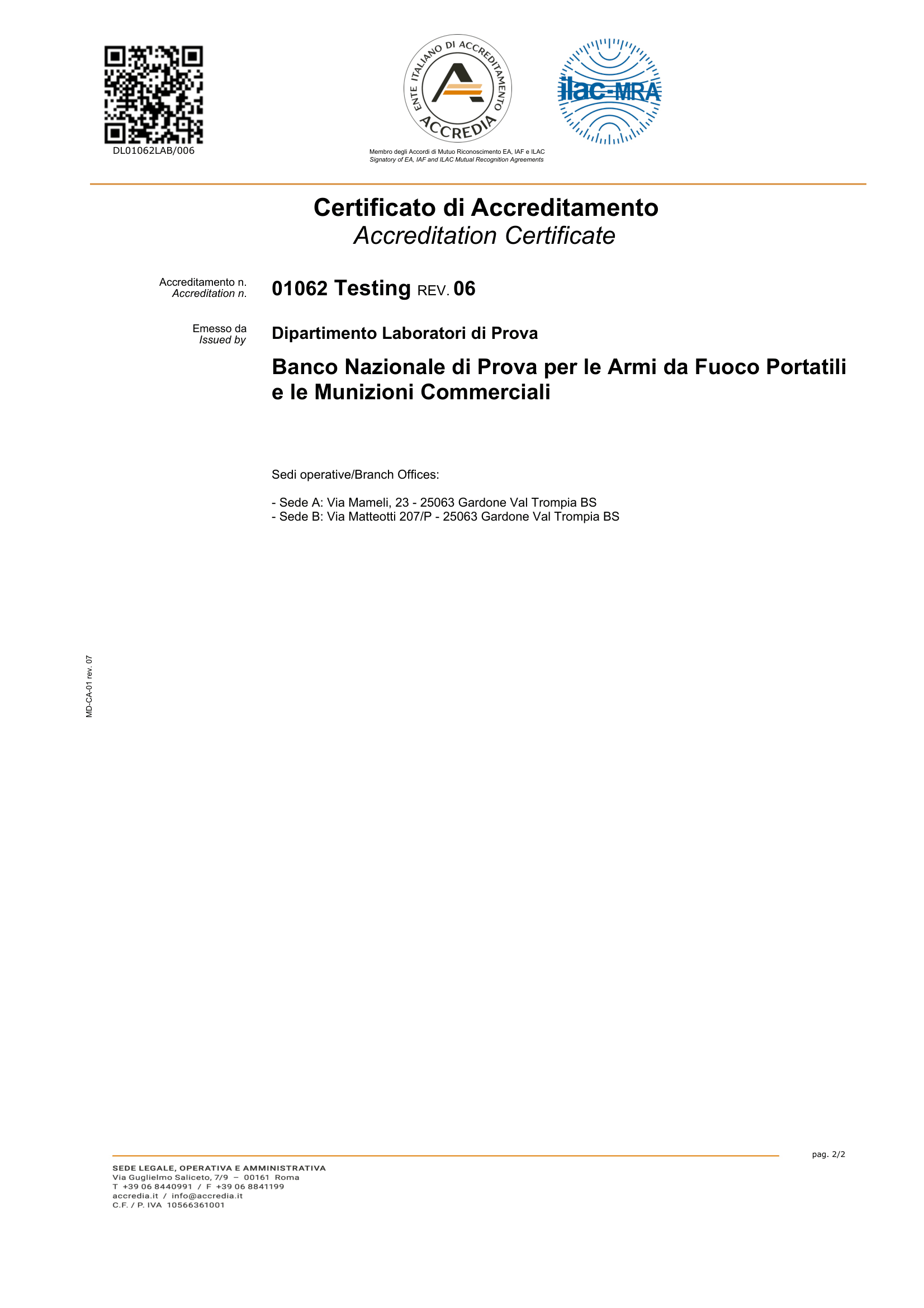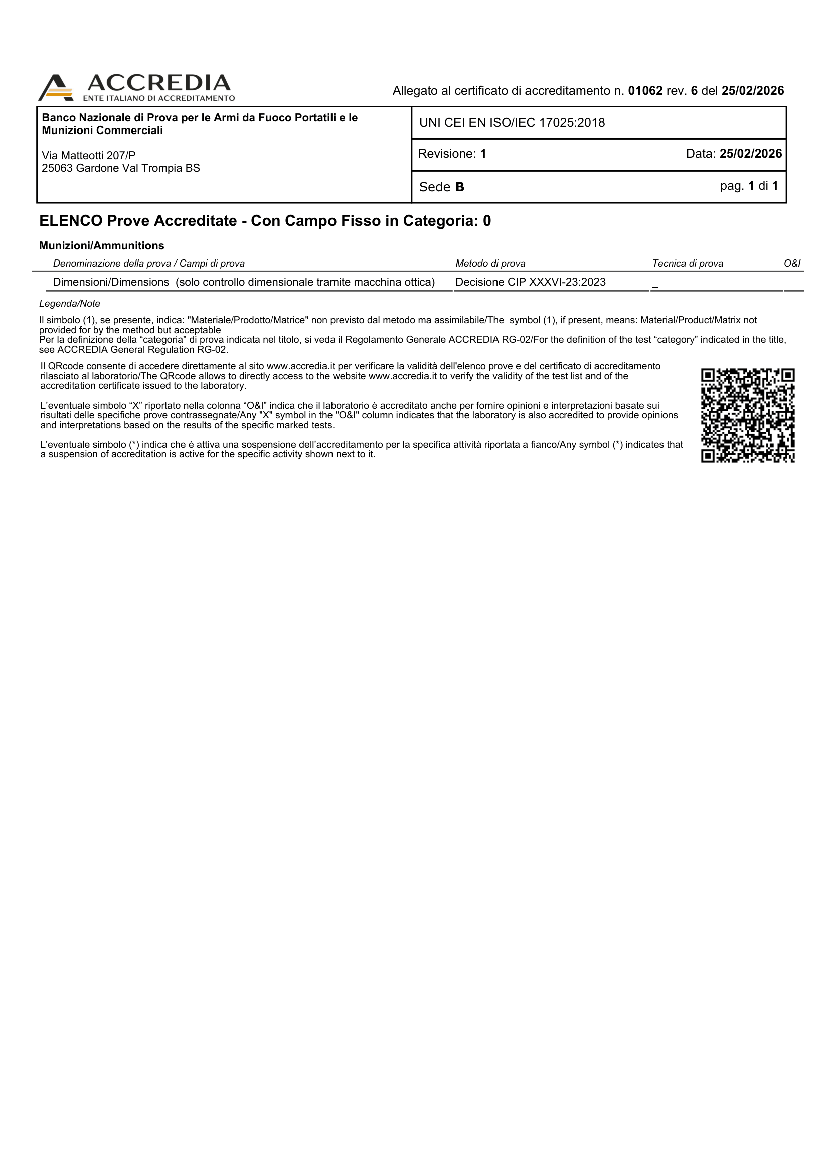 Nel 2014, il Banco Nazionale di Prova per le Armi da Fuoco Portatili e per le Munizioni Commerciali ha anche ottenuto l'accreditamento “Lab 17025” da "ACCREDIA" (UNI CEI EN ISO/IEC 17025:2005), l'Ente di Accreditamento Italiano membro delle reti internazionali degli Enti di accreditamento e firmatario dei relativi Accordi internazionali di Mutuo Riconoscimento, per la misura delle seguenti grandezze: